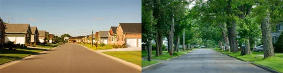 A whole street lined with trees can be more than 15 degrees cooler than a street without trees. Properly placed, trees reduce air conditioning needs by 30 to 50%. According to the US Dept. Of Agriculture, "The net cooling effect of a young, healthy tree is equivalent to ten room-size air conditioners operating 20 hours a day."